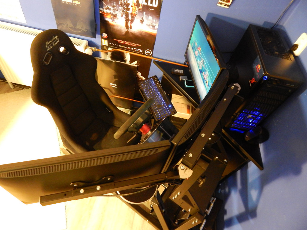 Pár fotek z mého nového přírůstku do rodiny. Jenom pro představu. Konstrukce je velmi pevná . Kombinace železných jeklů a pevných železných plátu. Jelikož Simetik.com sliboval že bude ještě i sedačka tak po 14 dnech od slibu jsem objednal bez sedačky. Tak nakonec jsem si na to namontoval svou. Cokpit má zakladnu řešenou tak že tam krasně našroubujete pojezdy i se sedačkou bez nějakých jiných problémů. Tedy žádné převrtávání , řezání ,vaření eee. Vše páslo jak p...l na hrnec. Celá sestava neosazená bez volantu, pedálů a monitorů váží 45 kg. Po osazení 3 monitorů a Fanatec setu něco přes 80 kg.