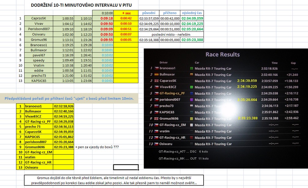 .....byl to náš první společný endurance v cupu, další budou určitě časem následovat. Předčasné ukončení RELAX PITu chápu jako nedůslednost pořadatele (speedy _HR), který připustil benevolenci výkladu pravidel těsně před závodem :( . Proto nebudou uděleny v tomto případě penalizace. Získaná časová výhoda už byla ve výsledku závodu dopočítána a když nebude podán další protest, jsou výsledky platné. Lhůta pro podání protestu uplyne dnes v 24:00 SELČ.
