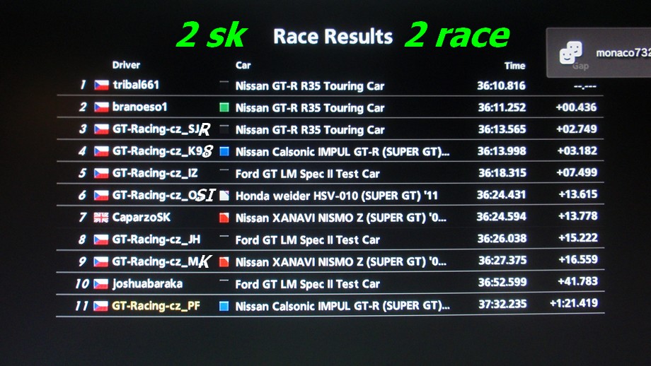 Tak prvý závod z mojej strany uplna katastrofa. Na začiatku som sa ako tak držal ale v šiestom kole po prvej prutko pravej zákrute som najel zoširoka na obrubnik a šmyklo ma do hodin a prask do múru uato na šrot tak som celé kolo odjel. Natankoval som 30 litrov a som si povedal skusim to dojst bez boxov dalšich. Nevim ako GT prepočítava spotrebu tak som skusil jazdit na nižšie otáčky jazdim jazdim a zostil som tak 3 kola pred cielom že pneu by vydržali ale benzinu malo tak do boxov dal som 10 litrov a idem. V poslednom kole som predbehol jedneho vidim asi nema benzin :D a už začal aj mne svietit na červeno sakra pred poslednou rychlou zakrutou pred bus stopom som stratil vikon a kusok predomnou boj ešte niekdo bez benzinu :D mohol som dat o par litrov viac no hrozne. Druhý závod som sa dostal dopredu a spravil som si náskok pred druhym aby nemohol využívat pitel. Nepočital som s tym že by som to vyhral ked som videl brana ako to tam bere jedneho za druhym. Ale tak darilo sa mi jazdit defenzivu ked som musel možno to niekomu prišlo že som jazdil zo strany na stranu ale to som jazdil len v tych technickych pasažach kvôli čo najlepšiemu nájazdu do zákruty netrénoval som len kvaldu som išiel par kol tak ma to auto vozilo troška. Posledne kolo s OSIM pri nájazde do poslenej rýchlej zákruty som mal dobrú rýchlosť bol som vedla teba vo vnútri zákruty nechcem som brzdit lebo som vedel že by som ta už nedal. Tak som do toho išiel agresivnejšie určite by to spravil aj brano aj sa mi zda že ma hebom zavodu dal v tej istej zakrute vnutrajškom niekto. Neviem čo bolo potom až na konci závodu som pozeral že si spadol dole. Neviem ako vidiš môj manévej ty ale mne to v tej chvíli došlo primerané.