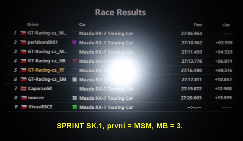 • startovní číslo -1- (Majkl) .... .............penalizace přičtení +10sec k celkovému času v cíli závodu za poškození vozu soupeře nárazem do boční části vozu v 10tém kole sprintu.